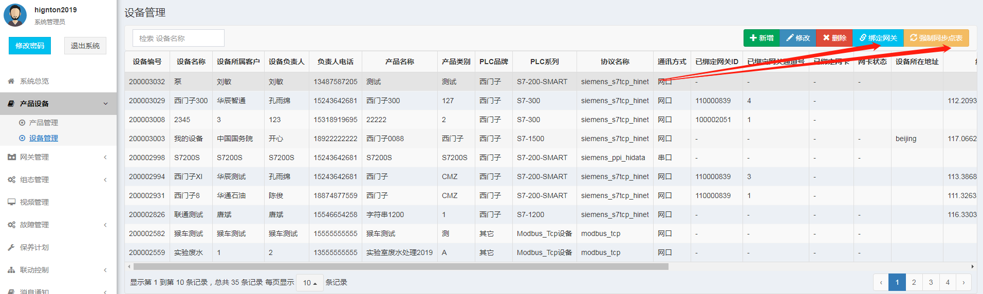 1. 點(diǎn)表中PLC的IP是否正確,以思普云平臺(tái)采集數(shù)據(jù)為例,思普云平臺(tái)的“產(chǎn)品設(shè)備”——“ 設(shè)備管理”處,選擇設(shè)備點(diǎn)擊【綁定網(wǎng)關(guān)】,設(shè)備IP填PLC的IP,再強(qiáng)制同步點(diǎn)表。