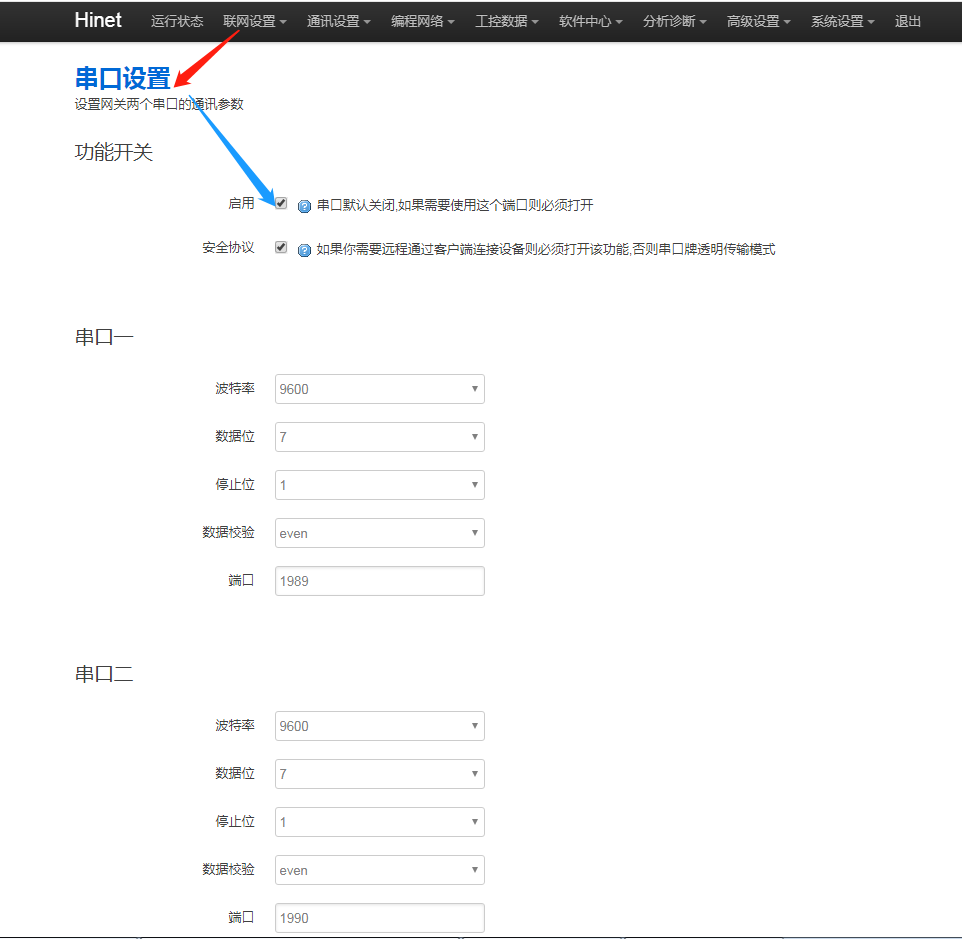 1. 如果是串口PLC,檢查串口是否打開,以及串口的端口是否正確,進(jìn)網(wǎng)關(guān)后臺(tái)“通訊設(shè)置 - 串口設(shè)置”,勾選【啟用】,串口一的端口為1989,串口二的端口為1990。